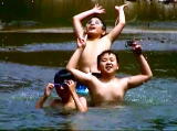 捻り飛込み・前飛込み・宙返り、いろいろな技を見せて、男子は得意満面。清流鏡川の水は冷たくて気持ちがいい。川で泳げることは本当に幸せ。この美しい自然を守っていこう。 |