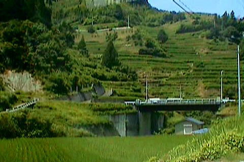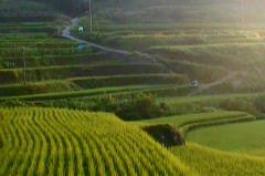 ここは時代が変わり、町は大きく変貌しても風景の中にどこか生活の臭いや、なつかしさを感じる不思議な魅力があるところである。パーフェクト山荘「ええじゃい家」付近。手入れの行き届いた見事な棚田が広がっている。急な傾斜に構築された棚田は、効率的な生産には不利な条件だが、美しい景観を保ち、心の安らぎを与えてくれる。 |