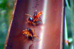 流しソーメンのレーンを利用して、沢ガニのレース。自分の沢ガニに声援をおくる。 |
