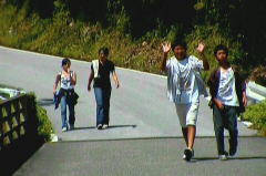 灼熱の山歩き4km。中間地点に行川小中学校がある。