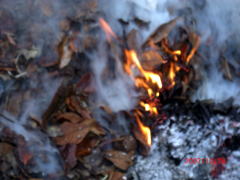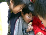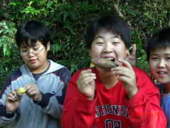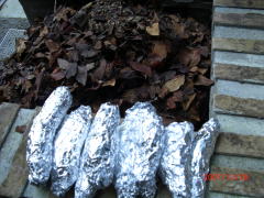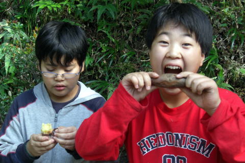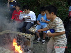 | 落ち葉で焼き芋は、子供たちが、ずっとやりたかったことの一つ。今や町ではたき火もできず、へたをすると火事と間違われる。子供たちにとって、これはとても新鮮な体験。みんなでワクワクしながら焼き芋の準備をした。 |