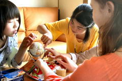 Ruthさんの国、イギリスを地球儀で見つけた生徒たち。(右)